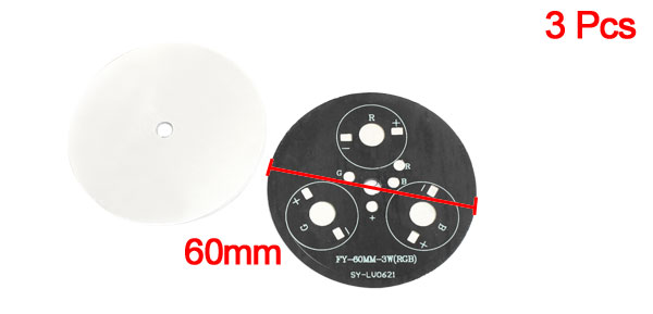Product Name Aluminum PCB Circuit Board Fit for 3pcs 1W/3W RGB LED Diameter 60mm/2.4" Thickness 1.4mm/0.05" Installation Hole Diameter 5mm/0.2" Net Weight 30g Materials Aluminum Package Content 3 x Aluminum PCB Circuit Board - Reviews