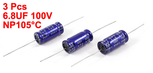 Product Name Electrolytic Capacitor Type Axial Lead Features Standard General Purpose Maximum Temperature NP105°C Withstand Voltage 100V Capacitance 6.8uF Body Size 10 x 23mm / 0.4'' x 0.9" (D*L) Lead Length 25mm/ 0.98", 30mm/ 1.2" Dielectric Material Aluminum Weight 8g Color As Picture Shown Package Content 3 Pcs x Electrolytic Capacitors - Reviews