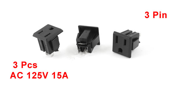 3 Pcs AC 125V 15A US 3 Pin Terminals Power Socket Connector Black
