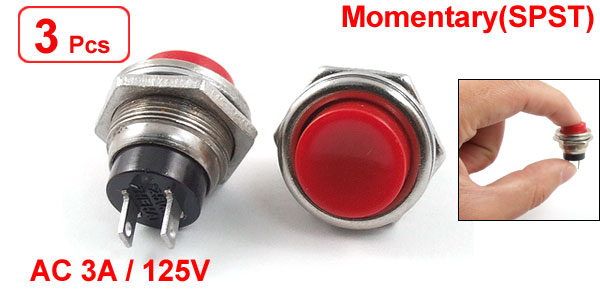 Product Name Push Button Switch Action Type Momentary Contact Type NO Poles SPST Rating Voltage AC 125V 3A Terminals Quantity 2 Pins Thread Dia. 16mm / 0.61" Button Dia. 13mm / 0.51" Terminals Pitch 5.5mm / 0.2" Overall Size 24 x 19mm / 0.9" x 0.7"(H * D) Material Plastic & Metal Color Red & Black Weight 26g Package Content 3 x Push Button Switch - Reviews