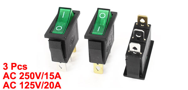 Item Name Rocker Switch Model KCD3 Type SPDT Position On/Off (I/O) Light Color Green Voltage & Current AC 250V/15A, AC 125V/20A Overall Size 3 x 1.4 x 3.2cm/ 1.2" x 0.55" x 1.3"(L*W*H) Body Color Black, Green Material Plastic, Metal Net Weight 21g Package Content 3 x Rocker Switches - Reviews
