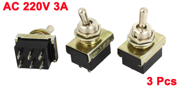3 Pcs AC 220V 3A 6-Pin DPDT ON/ON Self Lock 2 Positions Toggle Switches