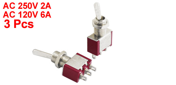 Thread Dia 6mm/0.24" Main Color Red, Silver Tone Product Name Toggle Switch Net Weight 13g Country of Manufacture CHINA Package Content 3Pcs x Toggle Switch Rating AC 250V 2A, AC 120V 6A Material Metal Contact Type SPDT Total Size 32 x 13 x 8mm/1.3" x 0.51" x 0.31"(L*W*Max.D) Pin Number 3 Positions 3 Positions(ON-OFF-ON) - Reviews