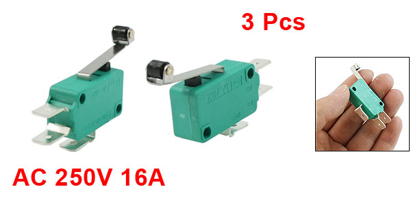 3 Pcs AC 250V 16A SPDT Long Hinge Roller Lever Momentary Micro Switch Green