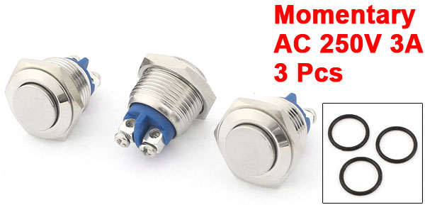 Item Name Push Button Switch Action Type Momentary Type Head Shape Flat Head Contact SPST(1NO) Switch Rating AC 250V 3A Terminals Number 2 Panel Cutout Diameter 16mm/0.63" Total Size 24 x 19mm/ 0.94" x 0.75" (L*Max.W) Material Metal, Plastic, Electric Parts Housing Color Silver Tone Weight 40g Package Content 3 x Push Button Switch - Reviews