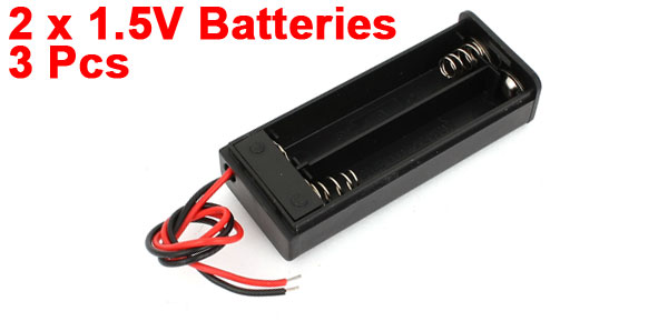 Product Name Battery Case Material Plastic, Electric Part Dimension 6.2 x 2.5 x 1.5cm/ 2.4" x 1" x 0.6"(L*W*H) Cable Length 14.5cm/ 5.7" Battery Type 2 x 1.5V Batteries(Not Include) Color Black Weight 40g Package Content 3 Pcs x Battery Case - Reviews