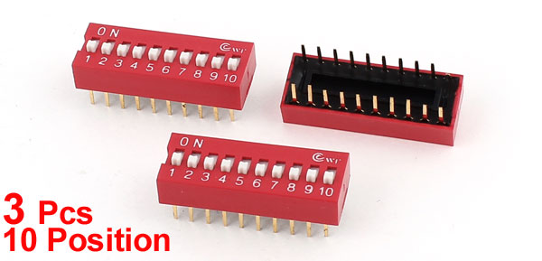 Product Name DIP Switch Type Slide Type Poles 10 Position 20Pin (2Row) Pitch 2.54mm Non-Switching Rating 100mA DC 50V Switching Rating 100mA DC 24V Dimension 27 x 10 x 10mm/ 1" x 0.39" x 0.39"(L*W*H) Material Plastic, Electric Parts Main Color Red, Gold Tone,White Weight 7g Package Content 3 Pcs x DIP Switches - Reviews