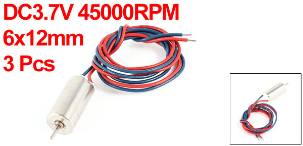 Details3 Pcs RC Helicopter Toys DIY Electric Mini Coreless Motor 6x12mm DC3.7V 45000RPM  Product Name DC Coreless Motor Rated Voltage DC 3.7V Current 100mA Speed 45000RPM Shaft Size 0.8 x 7mm/ 0.03" x 0.3"(D*L) Body Size 6 x 12mm/ 0.24" x 0.47" (D*H) Wire Length 7.5cm/3" Main Color Silver Tone Material Metal Net Weight 6g Package 3 x DC Coreless Motor
