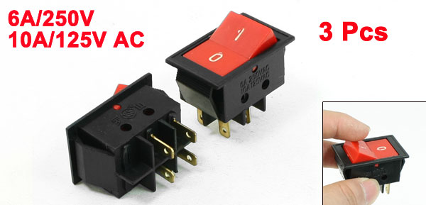 3 Pcs Red Button On/Off DPDT Boat Rocker Switch 6A/250V 10A/125V AC