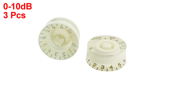 Details3 Pcs White Clear Round Insulating Voice Adjustable Rotary Knob 0-10dB  Product Name Rotary Knob Material Plastic Color White Clear Adjustable Range 0-10dB Fit for Shaft Hole Dia. 5.5mm/ 0.22" Knob Inner Dia 16mm/ 0.63" Overall Size 25 x 12mm/ 1" x 0.47"(D*H) Weight 11g Package Included 3 Pcs x Rotary Knobs
