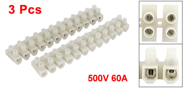 3 Pcs White Plastic 12 Way Dual Row Terminal Blocks Connector Strip 500V 60A
