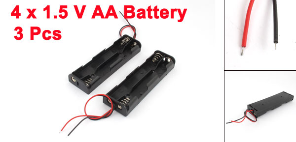 Details3 Pcs Wire Leads Plastic 4 x 1.5 V AA Battery Storage Case Holder Black  Main Color Black Fit for 4 x AA Battery(Not Included Here) Brand DMiotech Net Weight 38g Country of Manufacture CHINA Package Content 3 x Battery Holder Each Cable Length 15.5cm / 6.1" Fit Battery Power DC 1.5V Material Plastic, Metal Dimension 10.7 x 3.2 x 1.3cm / 4.2" x 1.3" x 0.5" (L*W*H)