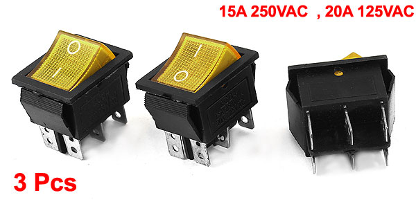3 Pcs Yellow Light DPDT Snap in Rocker Switch 15A 250VAC 20A 125VAC