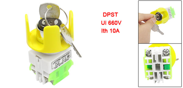 Product Name Pushbutton Switch Action Type Keylock Type Poles DPST Selector Switch Mode 3 Position Ui(AC-15) 660V Ith(AC-15) 10A Terminals Quantity 4 Screw Terminals Thread Diameter 22mm/0.8" Fit Panel Thickness(adjustable) 5mm/0.19".Max Overall Size 7.3 x 4.6 x 2.9cm / 2.8'' x 1.8'' x 1.1"(L*W*T) Material Plastic, Metal, Electric Parts Button Color Black Color White, Yellow, Black Net Weight 81g Package Content 1 x Pushbutton Switch