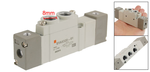 Product Name Air Operated Valve Model SYA5320-01 Actuation Type 3 Position Closed Center Thread Port Size 4mm/ 1/8" One-touch Fitting Port Size 8mm/ 1/4" Operating Pressure Rage 0.2-0.7MPa