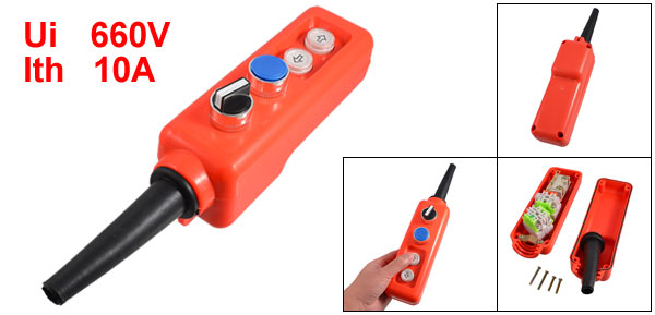Product Name Hoist Pushbutton Switch Model No. COB COJ2110 Push Buttons Momentray Blue Flat Button, Up and Down Button Selector Handle Mode 3 Position(ON-OFF-ON) UI 660V ITH 10A Main Body Size 30 x 6 x 8.5cm / 11.8" x 2.4" x 2.4"(L*W*H) Insulating Tube Length 9.8cm / 3.9" Fit Cable Diameter 1.2cm / 0.5" External Material Plastic, Rubber Color Orangere, Black, Blue,White