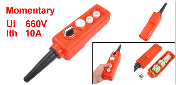 Product Name Hoist Pushbutton Switch Model No. COB COJ2125 Contact Type Momentary Selector Handle Mode 3 Position IEC 337 Ui 660V Ith 10A Push Buttons On/Off/On(black), White Push Button, Up, Down Main Body Size 20 x 5.8 x 6.5cm / 7.9" x 2.3" x 2.6"(L*W*H) Insulating Tube Length 10.2cm / 4" Fit Cable Diameter 1.1cm / 0.43" External Material Plastic, Rubber Color Orange Red, Black Net Weight 339g Package Content 1 x Hoist Pushbutton Switch - Reviews