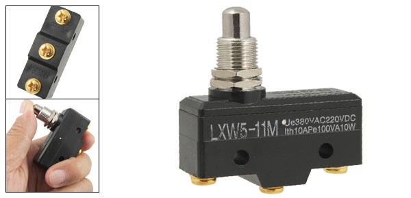 Product Name Limit Switch Model No. LXW5-11M Mounting Type Panel Mount Termination Style Screw Terminal Actuator Type Push Plunger Rating & Voltage Ue: AC380V, DC220V Ith: 10A, Pe100VA, 10W Switch Body Size ~5 x 1.7 x 2.7cm / 1.97 x 0.67 x 1.1"(L*W*H) Fixing Holes Dia. ~0.4cm / 0.16“ Distance Between Centers of Fixing Holes ~2.5cm / 0.98" Actuator Size Height from Body (open): ~2.3cm / 0.9” Height from body (closed): ~1.9cm / 0.75" Thread: ~1.2 x 1.4cm / 0.47 x 0.55" (D*H) Color Black & Silver Tone Net Weight 28g Package Content 1 x Micro Switch - Reviews