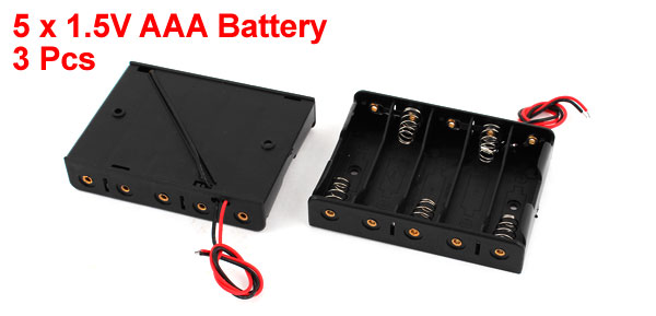 Product Name Battery Case Material Plastic, Metal Body Size 7.7 x 5.8 x 1.6cm/ 2.9" x 2.3" x 0.6"(L*W*H) Cable Length( Each ) 13cm/5" Battery Type 5 x 1.5V AAA Battery (Battery is not Included) Color Black Net Weight 51g Package Content 3 x Battery Case Holder - Reviews
