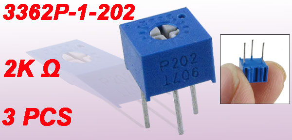 Product Name Trimming Potentiometer Model 3362P-1-202 Pin Number 3 Withstand Voltage 500V DC Rated Power 1/2 W Resistance Value 2K Ω Tolerance ±10% Adjustment Type Top Adjustment Mounting Type Through Hole(DIP) Turn Number Single Resistive Material Cermet Temperature Coefficient ±100ppm/°C Square Body Size 6.8 x 6.8mm/ 1/4" x 1/4" (L*W)