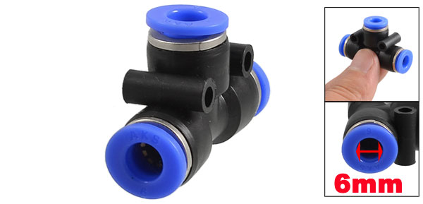 Product Name Pneumatic Quick Fittings Connector Type 6mm to 6mm ( T-shaped) Material Plastic Dimension (Approx.) 3.7 x 2.4 x 1.4cm/ 1.45" x 0.94" x 0.55" (L*W*T) Main Color Black, Blue Weight 18g Package Content 3 x Pneumatic Quick Fittings - Reviews