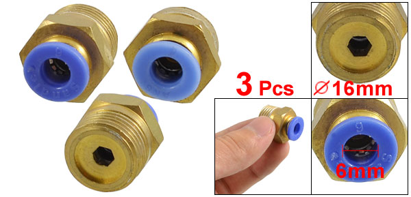 Item Name Quick Fittings Material Solid Brass, Plastic Color Gold Tone, Blue Thread Size 3/8" PT Thread Diameter 16mm Inner Diameter (Blue End) 6mm/ 0.24" Total Size 18 x 17mm/ 0.71" x 0.67" (L*Max. D) Weight 60g Package Content 3 x Quick Fittings - Reviews