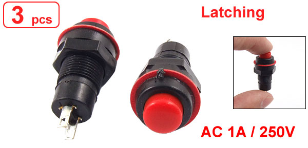 Product Name Push Button Switch Action Type Latching Contact Type NO Poles SPST Rating Voltage AC 1A / 250V Terminals Quantity 2 Pins Mount Size 9.5 x 17mm / 0.37" x 0.67"(D*T) Button Dia. 8mm / 0.31" Terminals Pitch 3.8mm / 0.15" Overall Size 15 x 30mm/0.6" x 1.18"(Max.D*H) Material Plastic & Metal Color Red & Black Weight 8g Package Content 3 x Push Button Switch - Reviews