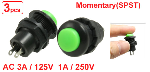 Item Name Push Button Switch Action Type Momentary Contact Type NO Poles SPST Rating Voltage AC 3A / 125V; 1A / 250V Terminals 2 Pin Install Size 12 x 22mm / 0.47" x 0.86"(D*T) Green Cap Diameter 9.6mm / 0.4" 2 Pin Space Pitch 5.3mm / 0.2" Total Size 26 x 16mm / 1" x 0.6"(Max. L * D) Material Plastic, Metal Color Black, Green Weight 7g Package Content 3 x Push Button Switch - Reviews