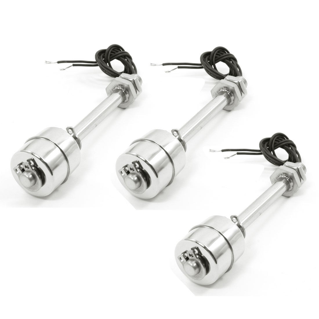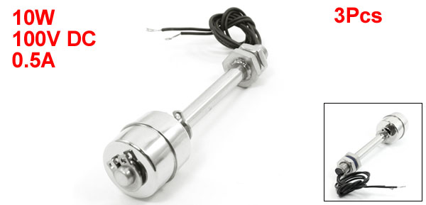 Details3 x ZS10010 Liquid Water Level Sensor Vertical Floating Switches 100mm Length  Product Name Floating Switch Model No. ZS10010 Max Contact Rating 10W Max Switching Voltage 100V DC Max Switching Current 0.5A Max Breakdown Voltage 220V DC Max Carry Current 1A Max Contact Resistance 100mΩ Max Temperature -30°C - +120°C Material Stainless Steel, SUS304 Thread Dia(Approx) 10mm / 0.39" Thread Length 15mm / 0.59" Switch Length(thread not included) 100mm / 3.9" Cable Length 34cm / 13.4" Color Silver Tone Net Weight 145g Package Content 3 x Floating Switch