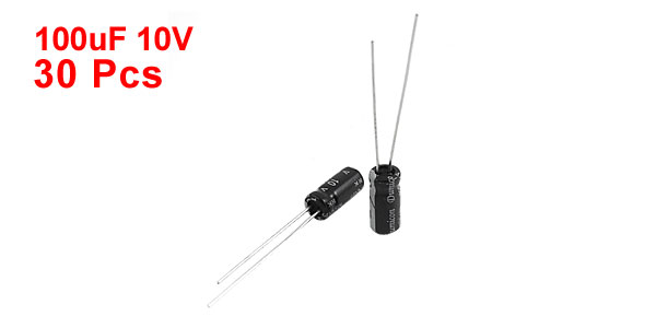 Product Name Electrolytic Capacitor Type Radial Lead Withstand Voltage 10V Capacitance 100uF Lead Spacing 2mm/ 0.08"(Center to Center) Lead Size 26 x 0.5mm / 1" x 0.02" (L*D) Lead Length 27mm/1.1", 21mm/0.83" Body Size 5 x 7mm /0.2" x 0.28" (D*L) Total Length 38mm/ 1.5" Net Weight 13g Color Black, Gray, Silver Tone Package Content 30 Pcs x Electrolytic Capacitor - Reviews