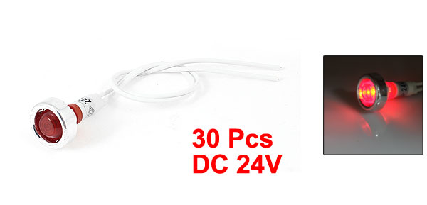 Details30 Pcs 10mm Mounted Hole White Cable Red Indicator Pilot Light DC 24V  Product Name Indicator Light Light Type Blub Working Voltage DC 24V Mounting Hole Dia 10mm/0.39" Light Color Red Body Size 3.3 x 2cm / 1.3" x 0.8"(L*Max.D) Cable Length 18cm / 7" Weight 122g Package Content 30 x Indicator Lights