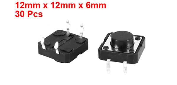 Product Name Tact Switch Type SPST Contact Type Momentary Contact Dimension 12 x 12 x 6mm / 0.47"x 0.47"x 0.24"(L*W*H) Overall Height 13mm / 0.51" Pin Pitch 13 x 4mm / 0.51" x 0.16" (L*W) Pin Length 4.5mm/0.18" Material Plastic, Metal, Electric Parts Color Black, Silver Tone Net Weight 26g Package Content 30 x Tact Switch - Reviews