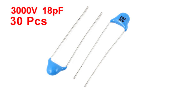 Details30 Pcs 18pF Through Hole DIP Ceramic Disc Capacitor 3000V  Product Name Ceramic Disc Capacitors Capacitance 18PF Rated Voltage 3000V Body Size 7 x 8 x 3mm/ 0.28" x 0.31" x 0.12"(L*W*T) Lead Space 7mm Lead Length 30mm Main Color Blue, Silver Tone Weight 12g Package Content 30Pcs x Ceramic Disc Capacitors