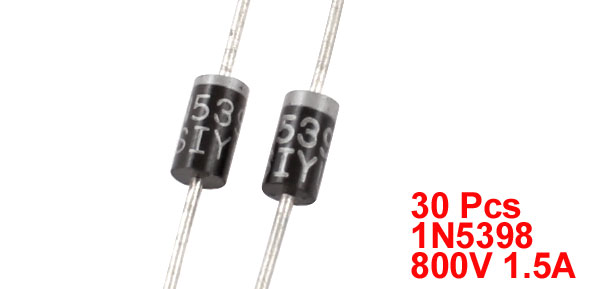 Product Name Rectifier Diodes Model 1N5398 Package Type DO-15 Maximum Repetitive Peak Reverse Voltage 800V Maximum Average Forward Rectified Current 1.5A Body Size 6 x 3mm / 0.24" x 0.12"(L*D) Length 60mm / 2.4" Color Black, Silver Tone Weight 13g Package Content 30 x Rectifier Diodes - Reviews