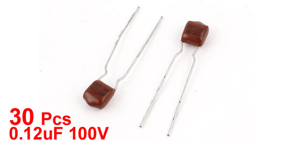 Details30 Pcs 2 Terminals Lead Polyester Film Capacitors CBB 0.12uF 100V  Product Name Polyester Film Capacitor Color Burgundy Material Polyester Film Capacitance 0.12uF Tolerance ±5% Voltage 100V Body Size 7 x 5 x 8mm/ 0.27" x 0.20" x 0.32"(L*W*T) Terminal Pin Distance 5mm/ 0.20" Net Weight 17g Package Content 30 Pcs x Polyester Film Capacitor