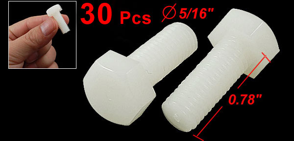Product Name Screw Type Hexagon Head Quantity 30 Pcs Thread Length 20mm/ 0.78" Thread Diameter 8mm / 5/16" Overall Size 25 x 14mm/ 1" x 0.55" (L*D) Material Plastic Color Off White Net Weight 53g Package Content 30 x Hexagon Head Screw - Reviews