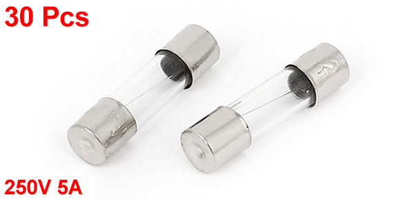 Details30 Pcs 250V 5A F5AL Quick Fast Blow Type Glass Tube Fuses 5mm x 20mm  Product Name Glass Tube Fuses Quantity 30 Features Fast Blow(F) Low Breaking Capacity(L) Rated Voltage 250V Rated Current 5A Body Size 5 x 20mm/ 0.2" x 0.8"(D*L) Material Glass, Metal Color Silver Tone, Clear Weight 21g Package 30 x Glass Tube Fuses