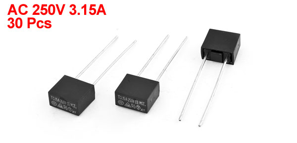 Product Name Fuse Rating 250V 3.15A Each Body Size 8 x 8 x 4mm/ 0.31" x 0.31" x 0.16"(L*W*T) Each Pin 2.3cm / 0.91" Material Electronic Parts, Metal Color Silver Tone, Black Weight 21g Package 30 Pcs x Fuses - Reviews