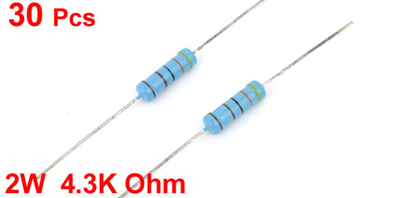 Product Name Metal Film Resistors Power Rating 2W Resistance 4.3K Ohm Tolerance ±1% Total Length(Approx.) 6.3cm /2.5" Body Size 4.5 x 14.5mm / 0.18" x 0.57" (D*L) Main Color Blue Weight 26g Package Content 30 Pcs x Metal Film Resistors - Reviews
