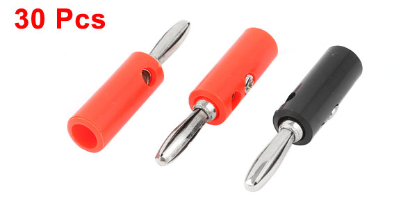 Details30 Pcs 4mm Audio Speaker Wire Cable Screw Banana Plug Connector Red Black  Product Name Banana Plug Material Metal, Plastic Color Red, Black, Silver Tone Banana Plug Dia. 4mm Total Size 40 x 8.5mm/ 1.6" x 0.33" (L*Max.D) Weight 86g Package Content 15 x Red Banana Plugs 4mm15 x Black Banana Plugs 4mm