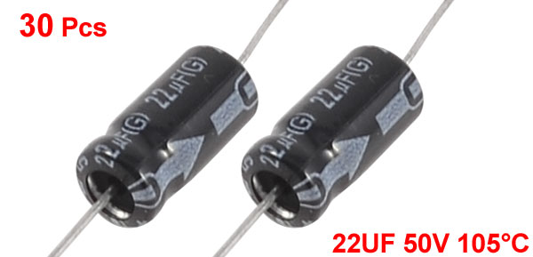 Product Name Electrolytic Capacitor Type Axial Lead Features Standard General Purpose Maximum Temperature 105°C Withstand Voltage 50V Capacitance 22UF Body Size 6 x 12mm / 0.2'' x 0.5'' (D*L) Lead Length 35mm/ 1.4'',41mm/ 1.6'' Dielectric Material Aluminum Weight 21g Color As Picture Shown Package Content 30 Pcs x Electrolytic Capacitors - Reviews