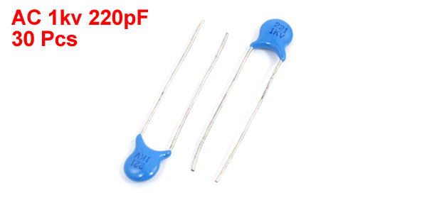 Details30 Pcs AC 1kv 220pF Radial Lead DIP Ceramic Disc Capacitors Blue  Product Name Ceramic Disc Capacitors Rated Voltage AC 1kv Capacitance 220pF Body Size 6 x 5 x 2mm/ 0.24" x 0.2" x 0.08" (L*W*T) Lead Space 4mm/ 0.16" Lead Length 22mm/ 0.9" Main Color Blue, Silver Tone Weight 7g Package Content 30 Pcs x Ceramic Disc Capacitors