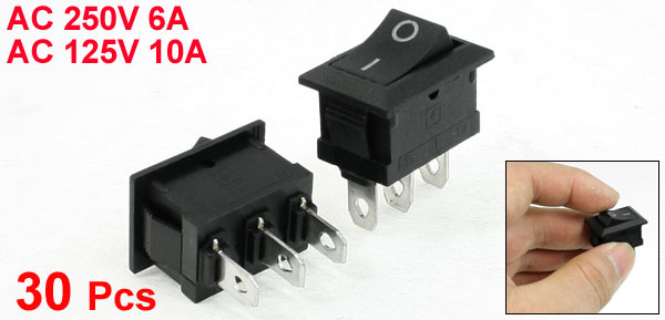 Product Name Rocker Switch Poles SPDT Terminals 3 Pin (On - Off) Rating Voltage AC 250V 6A, AC 125V 10A Total Size(Each One) 3.1 x 1.4 x 2.8cm/ 1.2" x 0.6" x 1.1"(L*W*H) Mount Hole Size 26 x 10mm/ 1" x 0.39"(L*W) Color Black Material Plastic, Metal Total Weight 116g Package Content 30 Pcs x Rocker Switch - Reviews