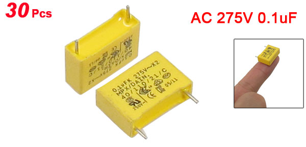 Product Name Safety Capacitor Dielectric Material Polypropylene Model MPX Series X2 Capacitance 0.1uF Tolerance ±10% Withstand Voltage 275V AC Rating Voltage 250V AC Body Size (Include Lead) 18 x 6 x 15mm / 0.7" x 0.2" x 0.6" (L * W * T) Lead Size (Approx.) 0.7 x 4mm / 0.03" x 0.2"(D * L) Lead Spacing (Approx.) 14mm / 0.6" Color Yellow Weight 50g Package Content 30 x Safety Capacitors - Reviews
