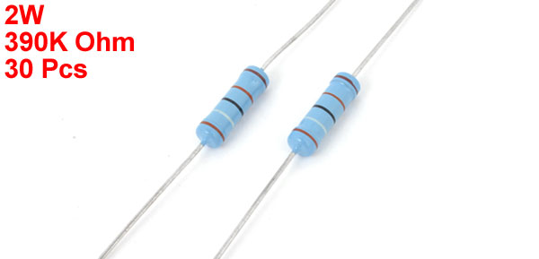 Product Name Metal Film Resistors Power Rating 2W Resistance 390K Ohm Tolerance ±1% Total Length(Approx.) 6.3cm /2.5" Body Size 4.5 x 14.5mm / 0.18" x 0.57" (D*L) Main Color Blue Weight 30g Package Content 30 Pcs x Metal Film Resistors - Reviews