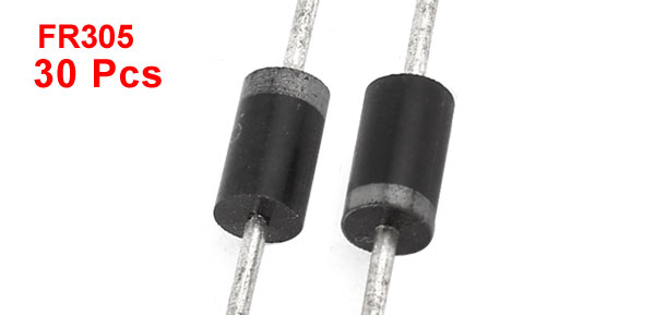 Product Name Fast Recover Rectifier Diodes Model FR305 Package Type DO-17 Maximum Repetitive Peak Reverse Voltage 600V Maximum Average Forward Rectified Current 3A Body Size 9 x 5mm / 0.35" x 0.2"(L*D) Length 60mm Color Black, Silver Tone Weight 36g Package Content 30 x Fast Recover Rectifier Diodes - Reviews