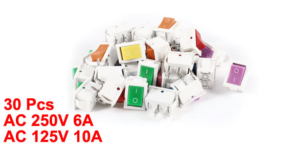 Product Name Rocker Switch Material Plastic Model KCD1 Contact Pin 2 Pin Switch Type SPST Voltage / Current AC 250V / 6A, AC 125V / 10A Size 20 x 15 x 17mm / 0.8" x 0.6" x 0.7"(L*W*H) Color Blue, White, Green, Yellow, Orange, Red, Purple Weight 98g Package Content 30 x Rocker Switches - Reviews
