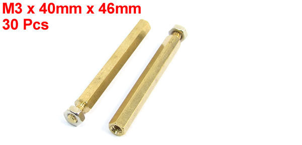 Product Name Standoff Hexagonal Spacer Thread Size M3 Male x M3 Female Male Thread Length 6mm/ 0.24" Body Length 40mm/ 1.2" Total Size(Approx.) 46 x 4.5mm/ 1.8" x 0.02" (L*Max.D) Material Brass Color Gold Tone Net Weight 174g Package Content 30 x Standoff Hexagonal Spacer