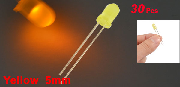 Details30 Pieces 5mm 2 Pin Round Head Superbright Yellow LED Light Diodes  Product Name Light Emitting Diodes Emitting Light Color Yellow Forward Voltage DC 3.0V Luminous Intensity 4000-6000 MCD Wavelength 520-525 nm Head Dia(Approx) 5mm / 0.197" Terminal Center Distance(Approx) 3mm / 0.11" Overall Height (Approx) 36mm / 1.4" Color Red Material Plastic, Metal Weight 10g Package Content 30 Pcs of Light Emitting Diodes