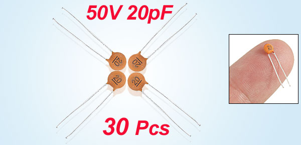 Product Name Ceramic Disc Capacitor Features Low Voltage Withstand Voltage DC 50V Capacitance 20pF Capacitance Tolerance ± 10% Lead Pitch Spacing 2.5mm / 0.1'' Body Dimension(Each) 3 x 1.5mm / 0.1" x 0.05"(D*T) Weight 2g Color As Picture Show Package Content 30 x Ceramic Disc Capacitors - Reviews